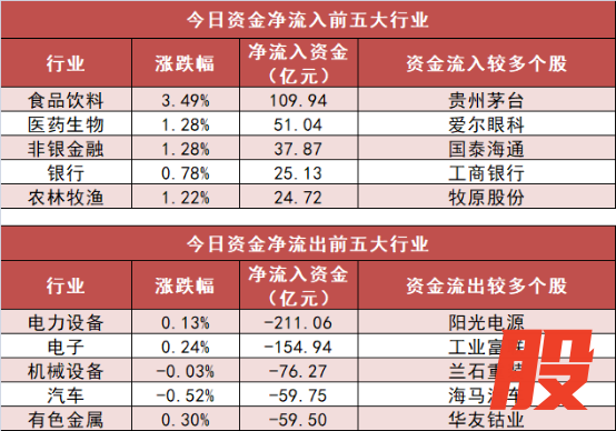 申万一级行业中,13个行业实现资金净流入,其中食品饮料行业净流入109.94亿元居首。