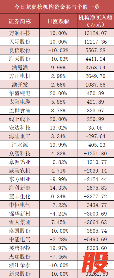 盘后龙虎榜数据显示,机构现身多股,其中万润科技等股票呈现机构资金净买入,新泉股份等股票呈现机构资金净卖出。