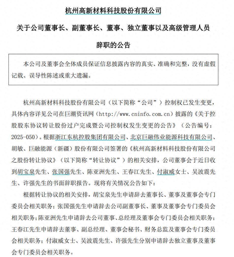 7名“董监高”同日辞职,与近期杭州高新的控制权变更直接相关。前一日,杭州高新发布公告称,东杭集团向巨融伟业转让其所持有的杭州高新19.03%股份事宜已完成过户登记,公司控股股东变更为巨融伟业,实际控制人变更为林融升。